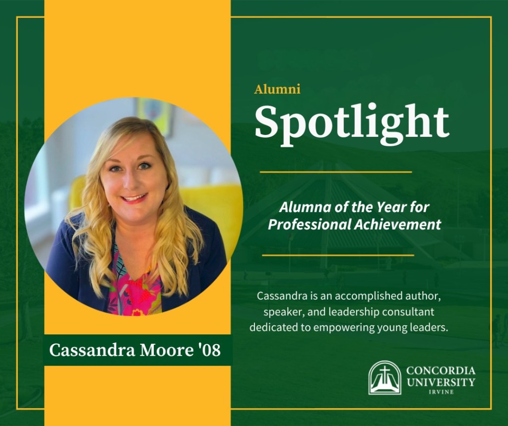 From Concordia University Irvine: Cassandra “Cassie” Moore ’08 is this year’s Alumna of the Year for Professional Achievement. Cassie is an accomplished author, speaker, and leadership consultant dedicated to empowering young people and leaders since 2008. This year, Cassie published three new books, including Saving Andiamo, the debut of her Gallivanter Saga, which ranked as the #1 new release in young adult travel books. Her inspiring insights on youth ministry and leadership have led her to keynote major conferences, including the National Lutheran Youth Workers Conference and multiple district youth gatherings across North America.